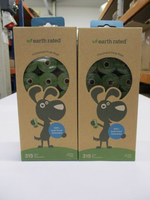 Five boxes of Earth Rated dog poop bags (Four cartons per box containing 2 dispensers, one box has three cartons and 900 bags) and two boxes of Earth Rated dog poop bags (Eighteen cartons per box containing 315 bags).