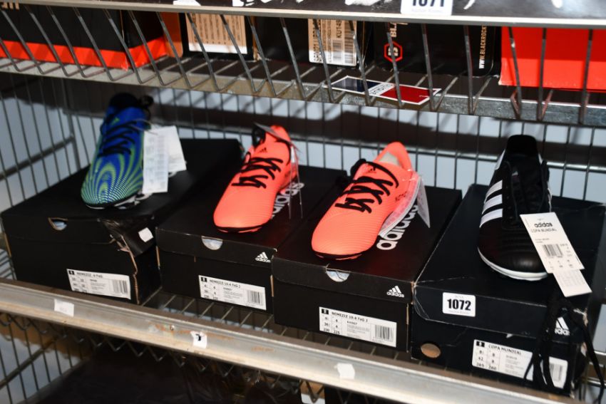Two pairs of children's Adidas Nemeziz 19.4 FxG football boots (UK 4), a pair of men's Nemeziz .4FxG football boots (UK 10) and a pair of Adidas Copa Mundial football boots (UK 8).