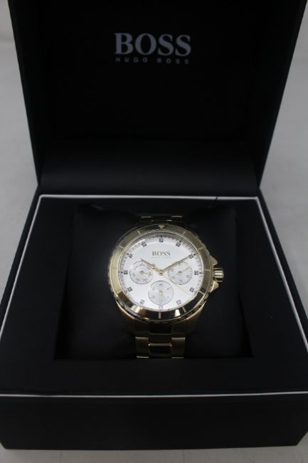 A women's boxed as new Hugo Boss Gold Chronograph Watch 39mm case/18mm Band Width/5 ATM (REF: 1502445).