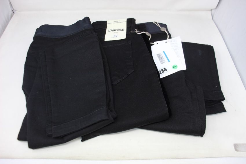 Two pairs of women's as new J Brand Dellah High Rise Leggings in black (27 & 28) and a pair of women's as new L'Agence Margot High Rise Skinny Jeans in black (27).
