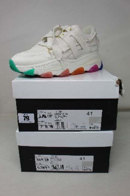 Two pairs of women's boxed as new Kurt Geiger London Lettie Trainers in white (EU 41, some minor damage to packaging).