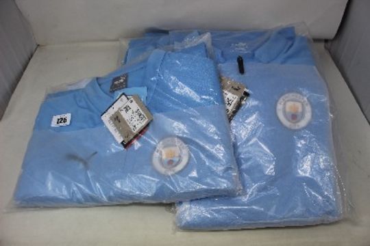 Four Manchester City Training Fleeces and two 1/4 Zip Tops in team blue, all as new (Various sizes).