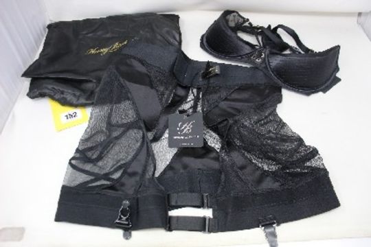 Three as new Honey Birdette Products to include 1x Mila Bra in Black (34DD), 1x Mila Brief in Black (Size M) and 1x Vesna Waspie in Black (Size M).