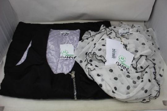 A women's Ganni Dotted Georgette Dress in white (Size 36) and a women's Ganni Recycled Nylon Asymmetrical Zip Vest in black (Size 36), both as new.