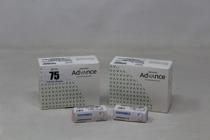Two as new Specsavers Advance RIC LI 819 hearing aids and two as new miniReceiver 2.0 (One M 2R, One M 2L).