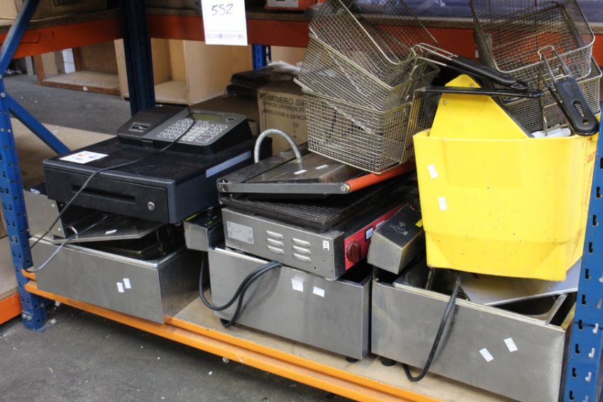 Three pre-owned countertop fryers to include Buffalo, a pre-owned Panini press, a Casio cash register and a cleaning bucket.