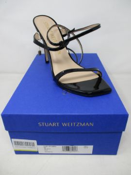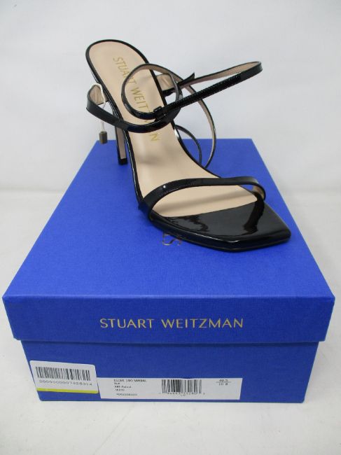 A pair of Stuart Weitzman Ellsie 100 black patent heeled sandals (Size EU 40.5).