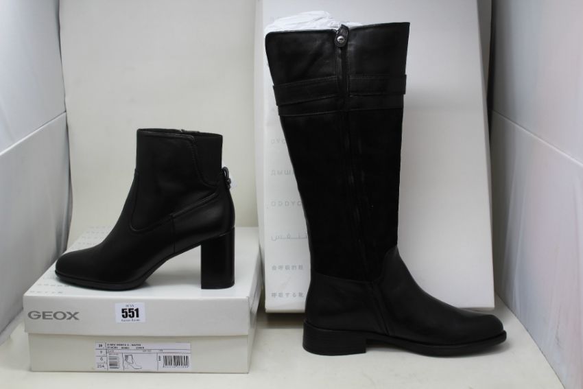 A pair of women's Geox leather and suede knee length black boots (UK 7) and a pair of women 's Geox side zip black ankle boots (UK 6).