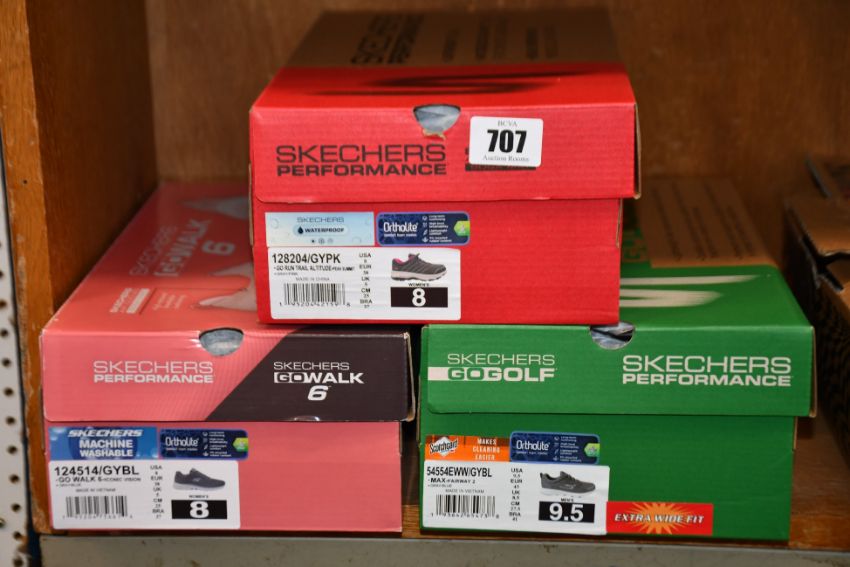 A pair of women's Sketchers Go Walk 6 Performance grey/blue trainers (UK 5), a pair of women's Sketchers Waterproof Go Run Trail Altitude grey/pink trainers (UK 5) and a pair of men's Sketchers Go Golf Performance grey/blue Max Fairways 2 trainers (UK 8.5).