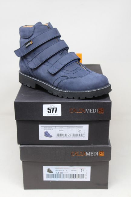 Two pairs of children's boxed as new Calzamedi boots EU 34 (4203:0202 in blue W 4 and 4201:0101 in black W 6).