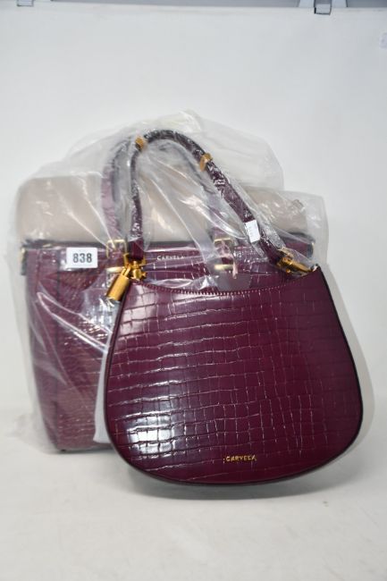 A Carvela Jamie winged wine croc print tote bag and a Carvela horseshoe shape wine tote bag.