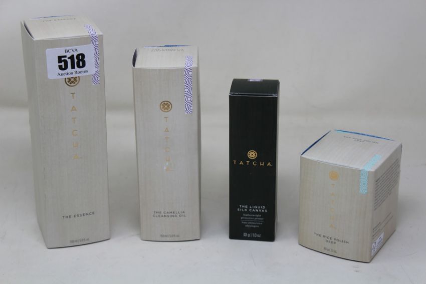 An as new Tatcha The Essence plumping skin softener (150ml), Tatcha The Rice polish Deep (60g), Tatcha The Silk Canvas (30g) and Tatcha The Camellia oil (150ml).