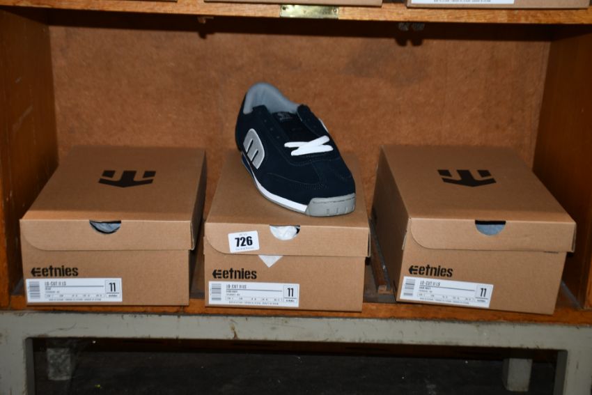 Three pairs of boxed as new Etnies Lo-Cut II shoes in dark navy and olive (UK 10).