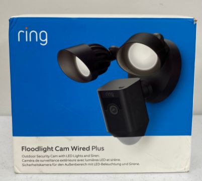 A boxed as new Ring Floodlight Cam Wired Plus in Black (Box opened) (EAN: 840080595283).
