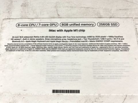 A boxed as new Apple iMac (M1, 2021) 24" with Retina 4.5K display, 8-core CPU, 7-core GPU, 256GB Storage in Blue (M/N: A2439 P/N: MJV93B/A) (Box opened, some cosmetic marks to outer and inner packaging).
