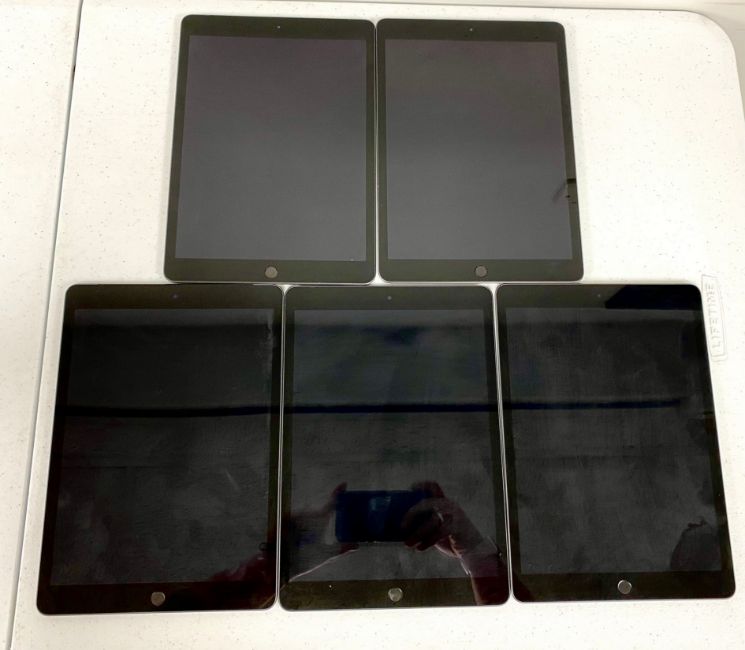 SOLD FOR PARTS: Five pre-owned Apple iPads in Space Grey; 2 x Apple iPad 10.2" 9th Gen (A2602, Wi-Fi Only), 1 x Apple iPad 10.2" 9th Gen (A2604, Wi-Fi/Cellular, Global), 1 x Apple iPad 10.2" 7th Gen (A2197, Wi-Fi Only) and 1 x iPad 10.2" 7th Gen (A2198, Wi-Fi/Cellular, Global) (All items iCloud account locked. Sold as seen for parts only).