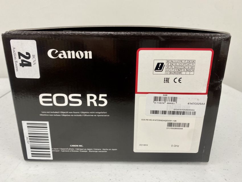 A boxed as new Canon EOS R5 Mirrorless Digital Camera (Body Only) (EAN: 8714574666051) (Box open, inner packaging sealed).