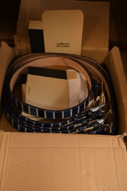 Seventeen men's as new Robert Charles Leather Patchwork Belts (7 blue, 10 brown, various sizes).
