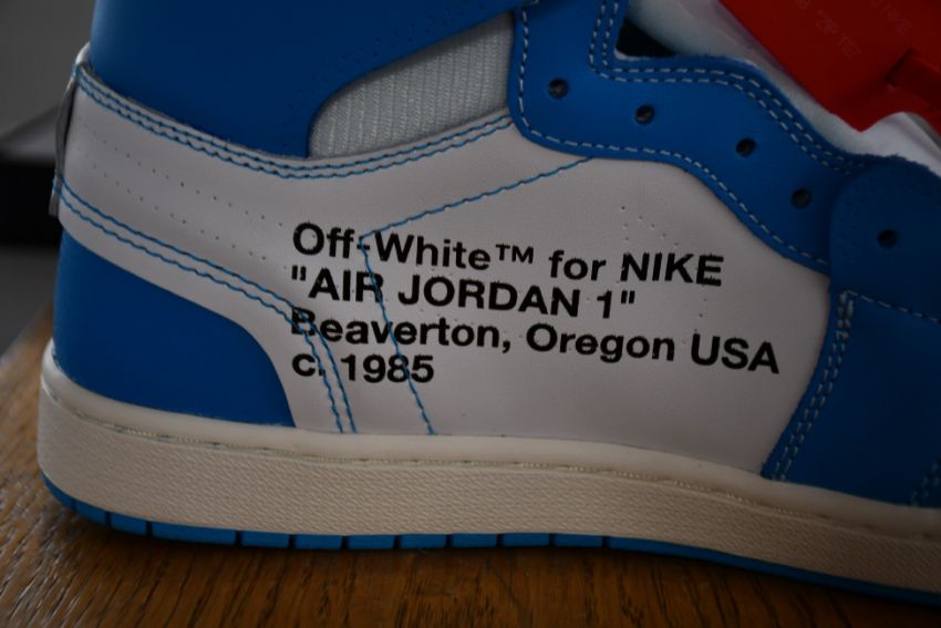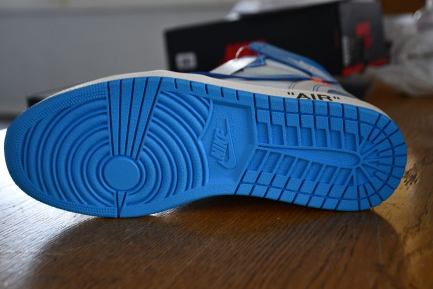 A pair of boxed as new Nike Jordan 1 X Off-White NRG white/DK powder blue cone, to include one white laces and one orange lace (Size UK 10).