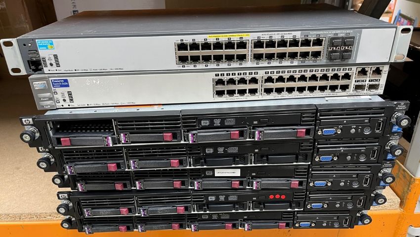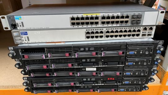 COLLECTION ONLY: 1 x HP ProCurve 2520G-24 J9299A 24-Port PoE Switch, 1 x HP ProCurve 2626 J4900C 24-Port Switch and 5 x HP ProLiant DL360 G7 1U Rack Servers (All items removed from a working office environment. No drives or licences included. Sold as seen).