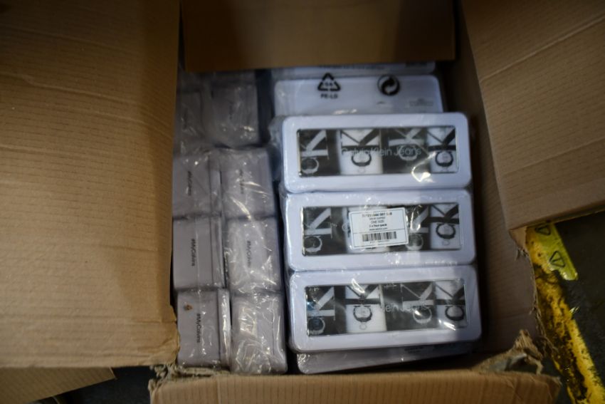 A quantity of Calvin Klein Jeans, black combo, one size, four pairs per tin (Approximately 35 tins x four socks).