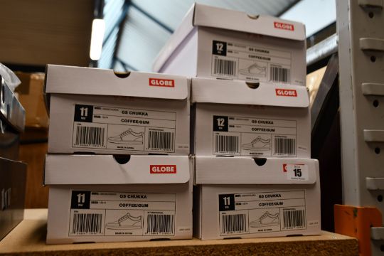 Five pairs of boxed as new Globe GS Chukka Skate Shoes in coffee/gum (USA 11 x 3, 12 x 2).