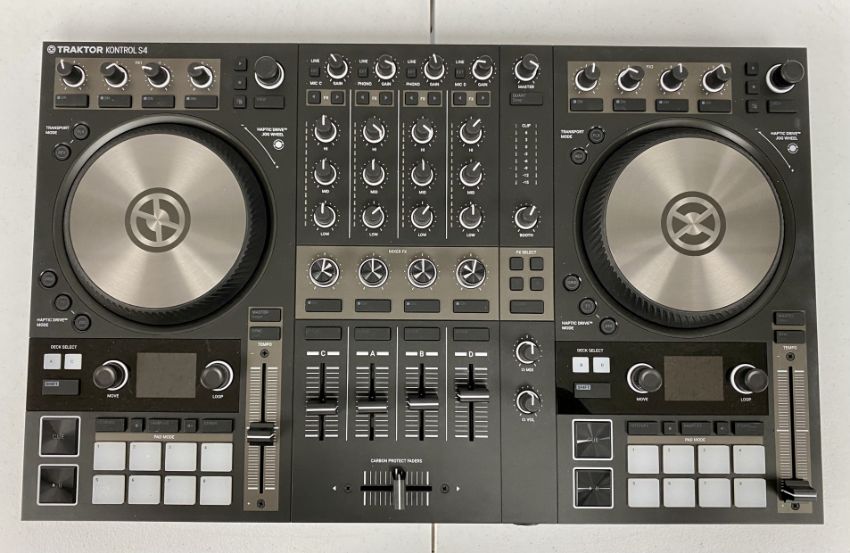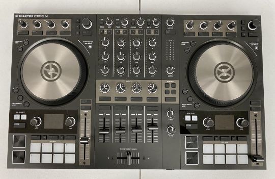 SOLD FOR SPARES OR REPAIR: A pre-owned Native Instruments Traktor Kontrol S4 Mk3 DJ Controller with UK PSU and orginal box (Powers on but software does not load, pad lights flash and tables turn at start up) (Sold as seen, for spares or repair).