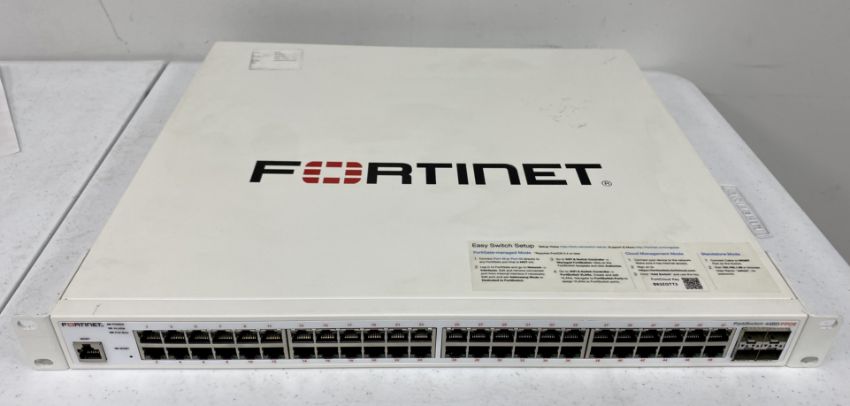 A pre-owned Fortinet FortiSwitch 448D-FPOE 48-Port Ethernet Switch (Grade B).
