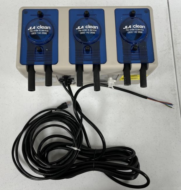 A pre-owned Hydro Systems JLA 3 Pump Total Eclipse Liquid Laundry Supply Dispenser (HYDSPL0111) with EG Machine Interface Module (HYD03-08771-05), Controller (6655720), fittings and manual (Box opened).