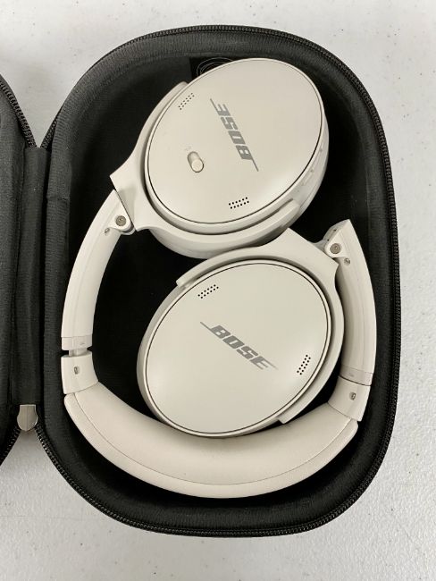 A pre-owned pair of Bose QuietComfort 45 Noise-Canceling Wireless Over-Ear Headphones in White Smoke with case, USB-C cable and 3.5mm Cable (Grade B).