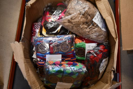 A box of assorted adults/kids socks, gloves and tights (Approximately 200 items).