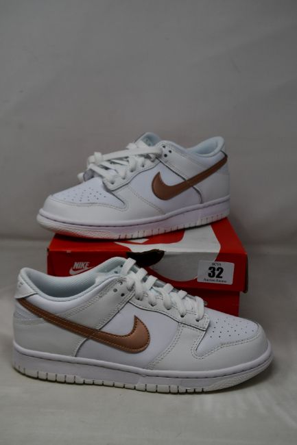 A pair of boxed as new Nike Dunk Low (GS) White/Metallic Red Bronze (UK 6).