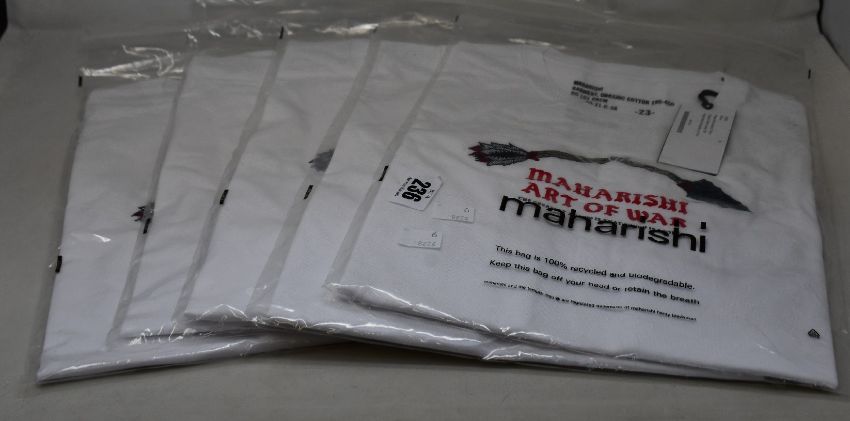 Five as new Maharishi 3655 Peace Embroidered Organic Cotton T-shirts in white (S, M, L, XL and XXL).