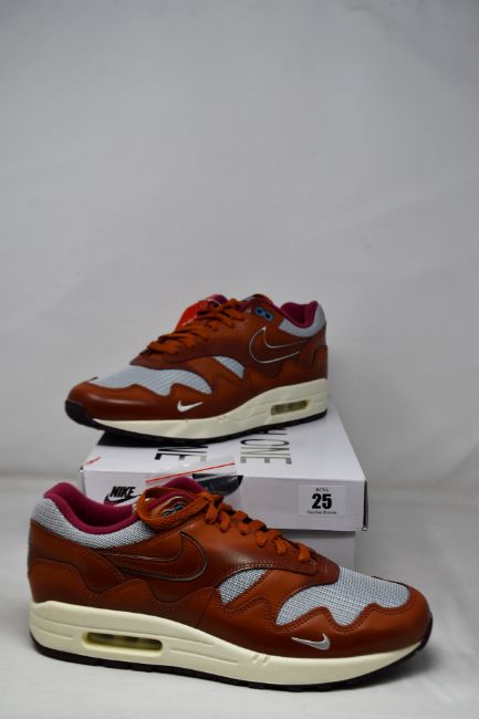 A pair of boxed as new Nike Air Max 1 Patta 'Waves' in dark russet (UK 10).