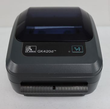 A pre-owned Zebra GK420d USB/Serial/Parallel 203dpi Thermal Label Printer (Power supply included) (P/N: GK42-202521-000).