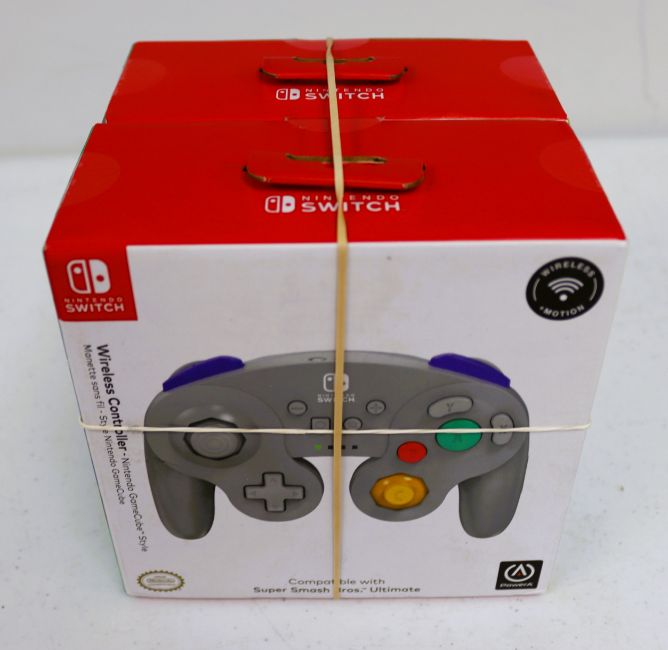 Two boxed as new PowerA Wireless GameCube Style Controllers for Nintendo Switch in Grey (Boxes Sealed) (EAN: 617885018770).