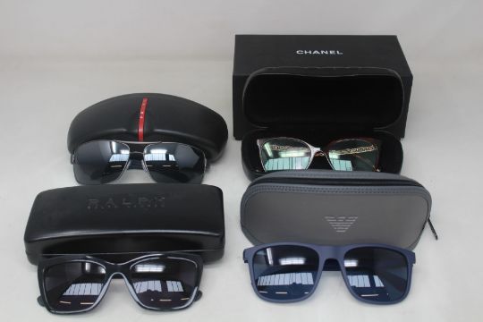 Three pairs of men's branded sunglasses to include Ralph Lauren, Prada, Armani and one pair of women's Channel glasses frames (All with cases).