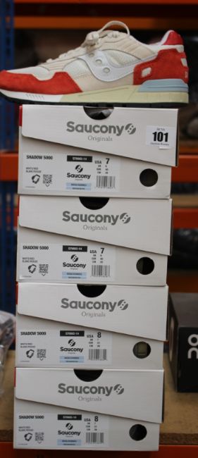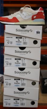 Four pairs of boxed as new Saucony Shadow 5000 Sneakers - White/Red (2 x UK 6, 2 x UK 7).