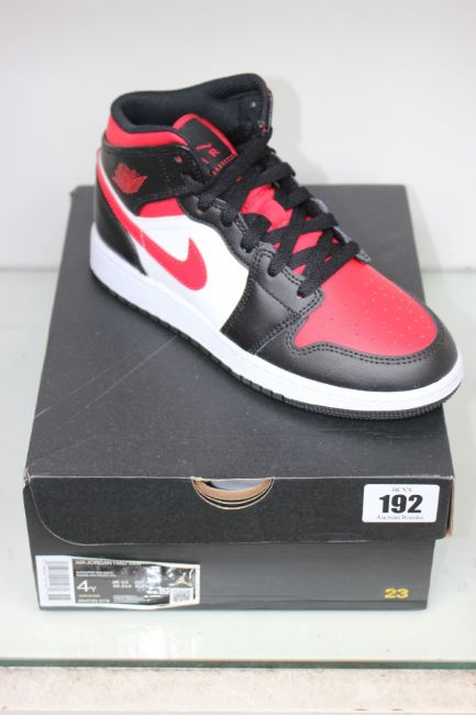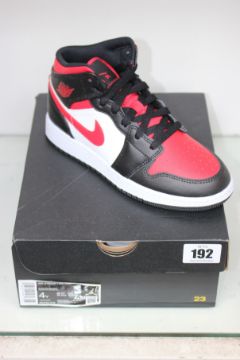 A pair of boxed as new Nike Air Jordan Mid (GS) - Black/Fire Red White (UK 3.5).