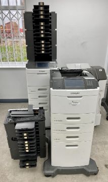 SOLD FOR PARTS: A pre-owned Lexmark M5170 A4 Mono Laser Printer with four extra paper feed trays and three 4-bin mailboxes and a printer chassis (Sold as seen, for parts only).