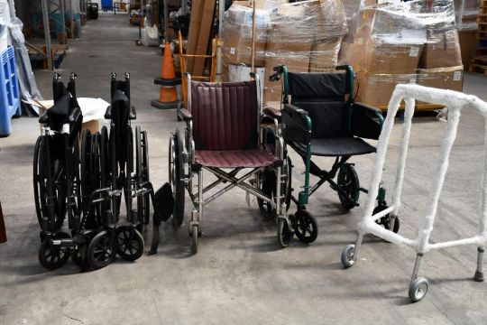 Four assorted folding wheel chairs and one Zimmer frame