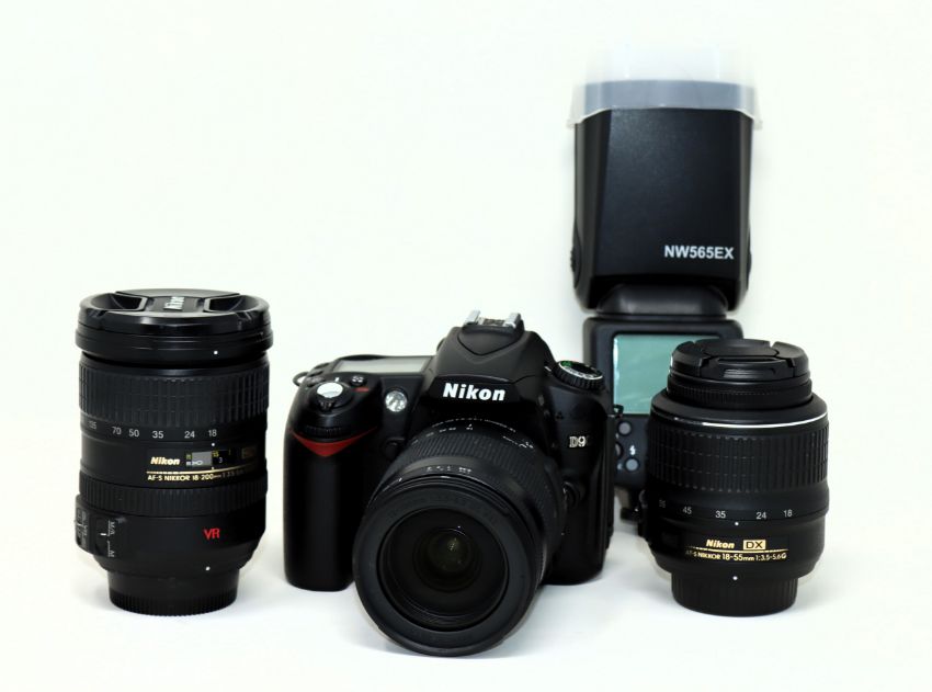 A pre-owned Nikon D90 Digital SLR Camera Body (1 x battery included) with a Sigma 18-200mm f/3.5-6.3 DC Macro Lens, a Nikon 18-200mm f/3.5-5.6G IF-ED AF-S VR DX Lens, a Nikon Nikkor AFS DX 18-55 mm f/3.5-5.6G VR Lens and a Neewer NW565EX E-TTL Flash in a canvas camera bag.