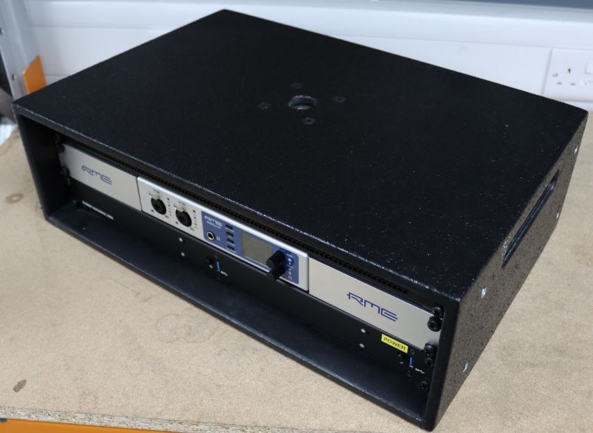 COLLECTION ONLY: A pre-owned RME MADIFACE XT Audio Interface and a Sonnet Rackmac Mini with a Apple Mac Mini (2018) with Intel Core i7 3.2GHz CPU, 64GB RAM, 2 x 500GB SSD running MacOS Ventura (iCloud account clear) in a custom rackmount enclosure with a monitor, keyboard, mouse and power cables, all in a foam lined Packhorse flightcase.