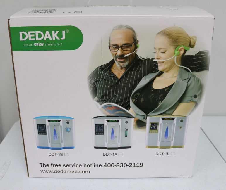 An as new Dedakj DDT-1A Oxygen Concentrator (Box opened, some damage to box).