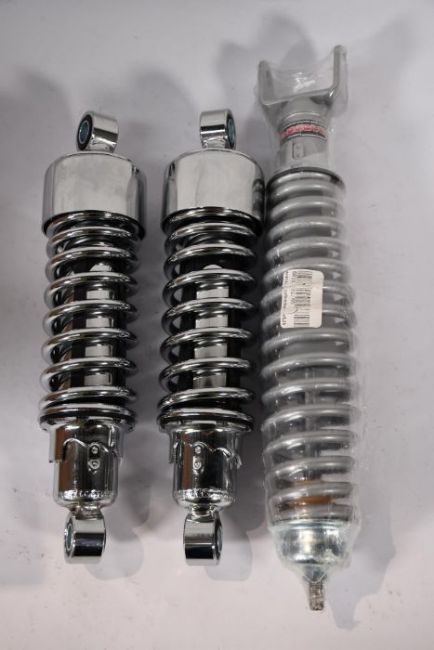 Two unbranded 10.5in motorcycle shock absorbers and an as new Carbone 6033.002/5A motorcycle shock absorber