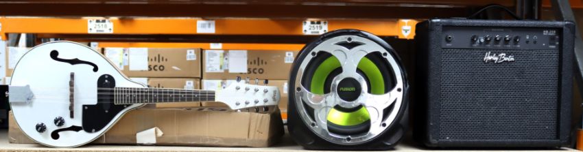 COLLECTION ONLY: A Stagg M50E Electro-acoustic Bluegrass Mandolin in White (Boxed, possibly pre-owned), a pre-owned Harley Benton HB-20B Bass Amplifier (EU plug) and a Fusion EN-AT1100 Encounter 10" Active Enclosure Bass Tube (Cosmetic damage to casing) (All items untested,sold as seen).