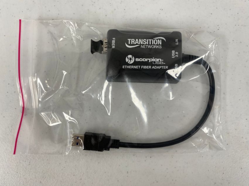 A boxed as new Transition Networks TN-USB3-SX-01(LC) Scorpion-USB 3.0 Gigabit Ethernet Fibre Adapter (UPC: 648177040278).