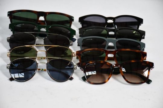 Ten assorted pre-owned Lacoste sunglasses to include L258S, L959S and others (Good Condition).