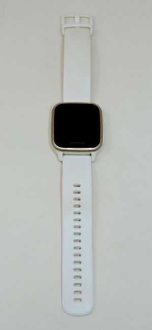 A pre-owned Garmin Venu Sq GPS Smartwatch in White/Gold (Factory reset. Some discolouration to back of watch).