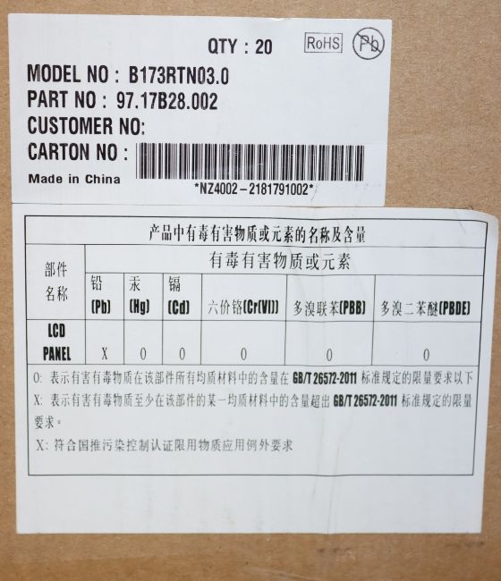 Twenty as new AUO B173RTN03.0 HW1A Replacement LCD Screens (P/N: 97.17B28.002) (Box opened, inner packaging sealed).